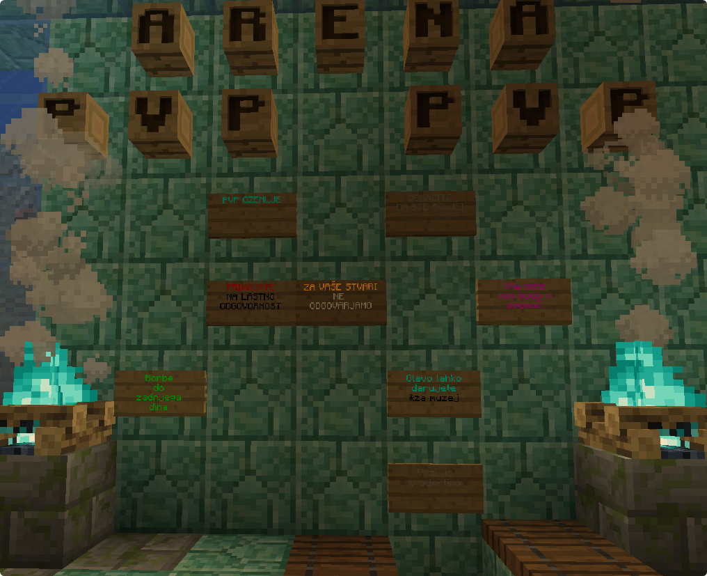 ČE BI ŽELELI, DA JE VAŠE OZEMLJE SPREMENJENO V PVP ARENO SI DOBRO PREBERITE VSE ZAHTEVE TER POGLEJTE ARENE DRUGIH. ZATEM ODPRITE TICKET NA NAŠEM DISCORD STREŽNIKU IN POČAKAJTE NA OSEBJE.