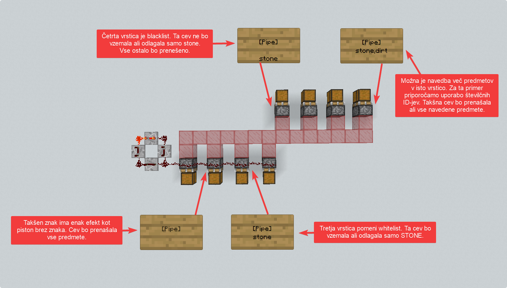 Obstajata dva tipa filtriranja. Blacklist (Črna lista, ti predmeti bodo ignorirani) ter whitelist (Cev bo prenesla samo te predmete). Znaki so lahko postavljeni samo na sticky ali na navadnem pistonu.